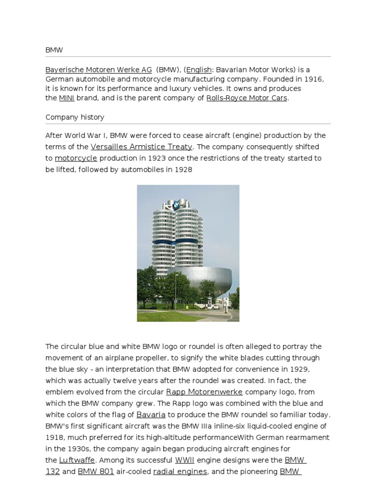 Bayerische motoren werke ag, popularly known as bmw, is a global manufacturer and marketer of luxury automobiles. It was originally an aircraft engine manufacturer and was also a major producer of motorcycles. ˈbeːˈʔɛmˈveː (listen)), is a german multinational corporation which produces luxury vehicles and motorcycles. Mobility joint ventures of the bmw group and daimler ag. The company divides its activities into four segments: Automotive, motorcycles, financial services and other entities. Bayerische motoren werke ag (bmw), german automaker noted for quality sports sedans and motorcycles. Bayerische motoren werke ag, commonly referred to as bmw (german pronunciation: